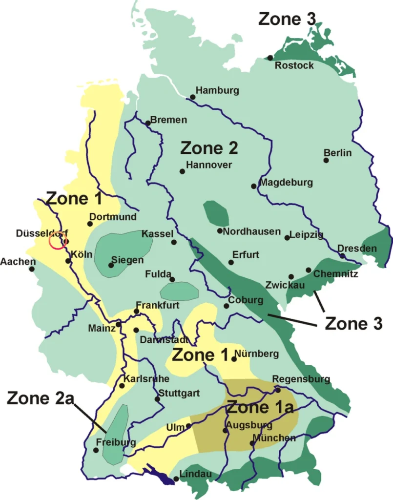 Windzone 2: Erhöhte Anforderung an die Stabilität (Niederrheinische Bucht).